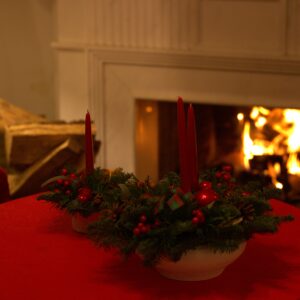 Utrzymany w ciepłej, czerwonej kolorystyce – z szyszkami, bombkami, kokardkami i zimowymi akcentami.Stroik jest osadzony w ceramicznej, białej doniczce z mokrą gąbką florystyczną, dzięki czemu: