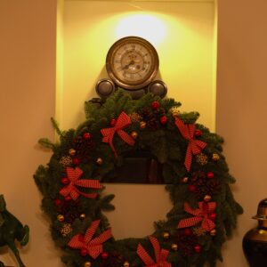 Dekorowany klasycznymi kokardami, szyszkami, czerwonymi akcentami i złotymi detalami, świetnie wpisuje się w świąteczny klimat – bez plastiku, bez kiczu, w pełni naturalnie.